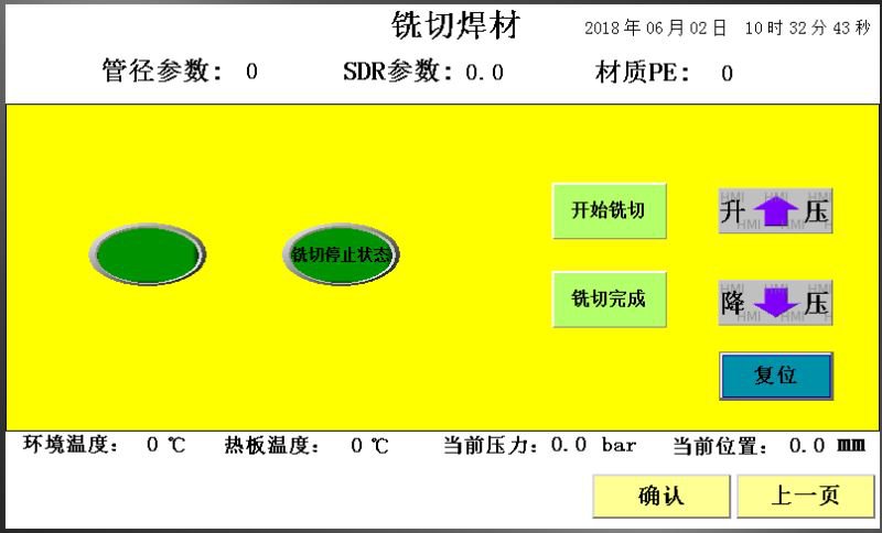 此界面可以进行手动和自动模式的切换,切换到手动模式后,可以进行4项手动操作,热板升温降温,铣刀铣切停止,机架前进后退,放下热板。